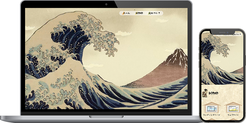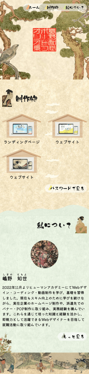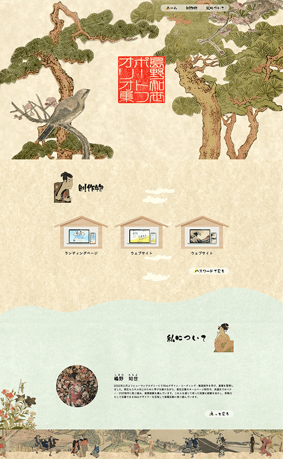 浮世絵を題材に、和風で印象に残るデザインを目指しました。世界観を出すため、実際のポストカードや雑誌から浮世絵素材を収集し、After Effectsで取り込み、トップ動画やタイトル横の装飾に動きを加えています。背景には紙をスキャンした画像を使用し、質感のある表現を取り入れました。動きを多く取り入れている分、全体のレイアウトはシンプルにまとめ、印象に残りつつも見やすさと分かりやすさを両立しました。
